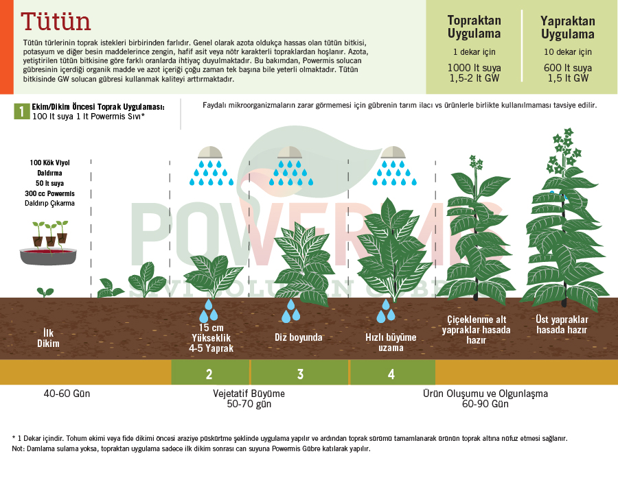 Tütün türlerinin toprak istekleri birbirinden farlıdır. Genel olarak azota oldukça hassas olan tütün bitkisi, potasyum ve diğer besin maddelerince zengin, hafif asit veya nötr karakterli topraklardan hoşlanır. Azota, yetiştirilen tütün bitkisine göre farklı oranlarda ihtiyaç duyulmaktadır. Bu bakımdan, Powermis organik sıvı solucan gübresi solucan gübresinin içerdiği organik madde ve azot içeriği çoğu zaman tek başına bile yeterli olmaktadır. Tütün bitkisinde Powermis organik sıvı solucan gübresi kullanmak kaliteyi arttırmaktadır.